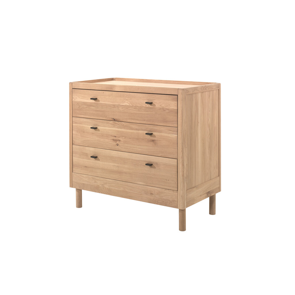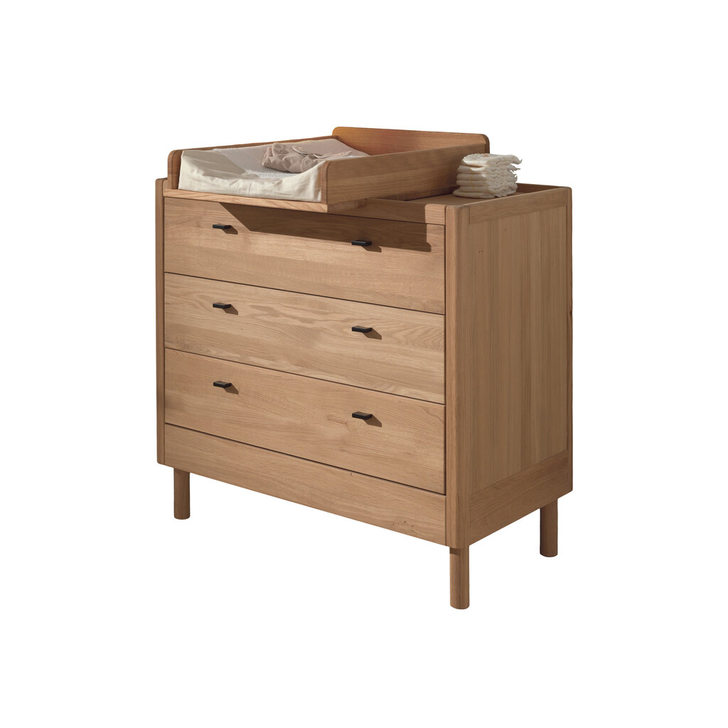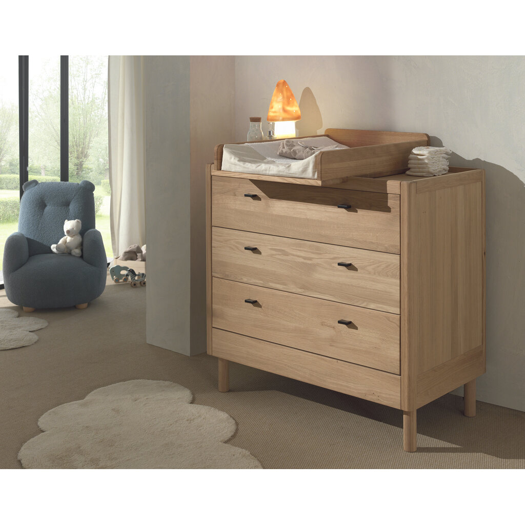 De commode beschikt over drie ruime lades, ideaal voor het overzichtelijk opbergen van kleertjes, luiers en verzorgingsproducten. De lades zijn stevig uitgevoerd en afgewerkt met subtiele zwarte handgrepen, wat zorgt voor een moderne en verzorgde uitstraling. Op het blad is voldoende ruimte voor een verzorgingskussen, waardoor de commode ook uitstekend functioneert als verzorgingsmeubel.