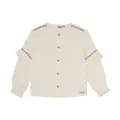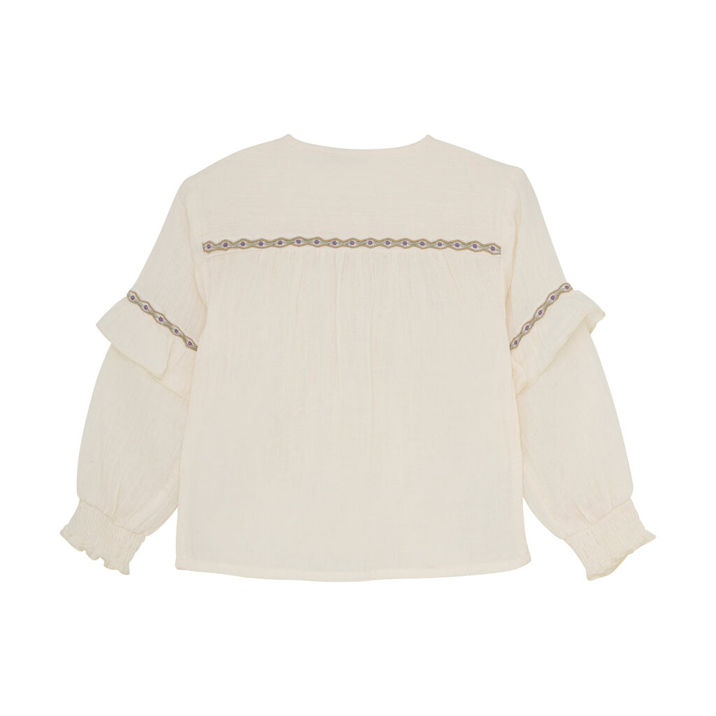 De blouse is rijk aan mooie details: subtiele ruches aan de mouwen met een elastische afwerking zorgen voor een speelse, elegante look, terwijl de fijne borduursels op de schouders, rug en mouwen een romantisch accent toevoegen. De knoopsluiting aan de voorkant maakt het aan- en uitkleden gemakkelijk en geeft de blouse een klassieke uitstraling.
